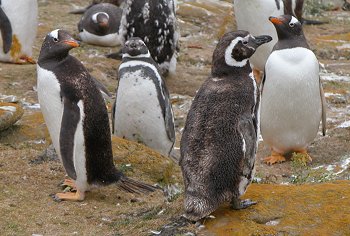 Continuing the walk uphill against a bit of a strong breeze we made visual contact with the beach on the other side. Close by was a large group of Gentoo penguins, with some Magellanic interlopers. Onto the beach and head down against the wind and the loose sand blasting against our faces we arrived at a rocky crag area in time to see a couple of battalions of rockhoppers come out the sea and sticking together advance up the hill. Also around the crags were oyster catchers and dolphin gulls, plus a variety of other birds.