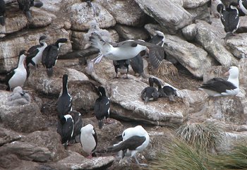 Up the steep hill that these penguins were going, was the colony of Black Browed Albatrosses and Shags. The area was a hive of activity with albatrosses and shags flying in and the rockhoppers jumping around to find their homes.